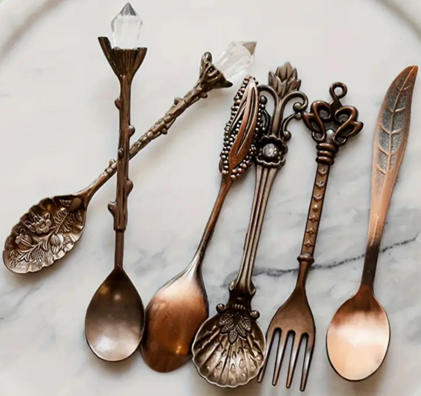 Introducing our stunning Copper Spoons set of 6, perfect for adding a touch of elegance to your dining experience. Each spoon and fork in this set boasts a beautiful antique-style copper look, adding a hint of vintage charm to your table setting. Measuring 6 inches long, these spoons are the ideal size for enjoying desserts, coffee, or tea. With 6 pieces in the set, you'll have enough to entertain guests or for everyday use. Elevate your dining experience with these exquisite copper spoons and add a touch of sophistication to your table.