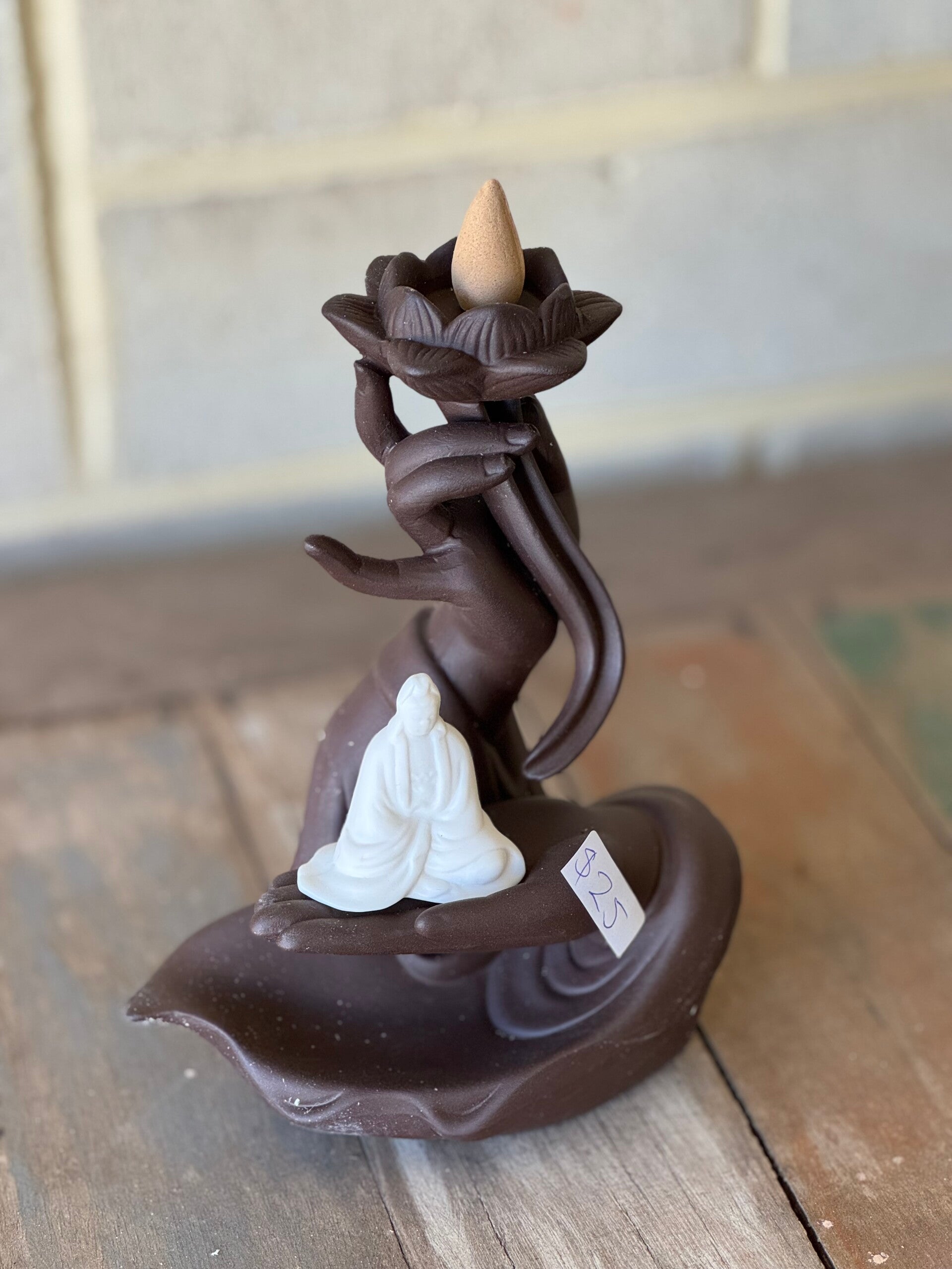Introducing our stunning Lotus Buddha Hand Backflow Incense Burner, the perfect addition to your home or meditation space. Made from durable and high-quality ceramic, this burner features intricate detailing and a serene lotus flower design. Standing at 18cm high and 14.5cm wide, it is the ideal size for creating a calming atmosphere and adding a touch of elegance to any room. As the backflow incense cones burn, the smoke will gently flow down the hand of the Buddha, creating a mesmerizing and peaceful effect. Elevate your incense experience with this beautifully crafted Lotus Buddha Hand Backflow Incense Burner.