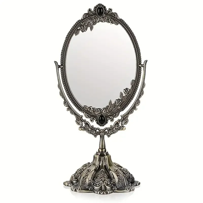 Add a touch of vintage elegance to your vanity with our Vintage Mirror Rose Floral design. Crafted from durable metal, this mirror features a 360-degree rotating design for easy and convenient use. Measuring 31cm in height and 22cm across, it’s the perfect size for all your beauty needs. The vintage-style intricate floral design adds a touch of old-world charm, double-sided with sturdy base ensures stability. Whether you’re applying makeup or styling hair, this mirror is a beautiful and functional addition to your beauty routine.